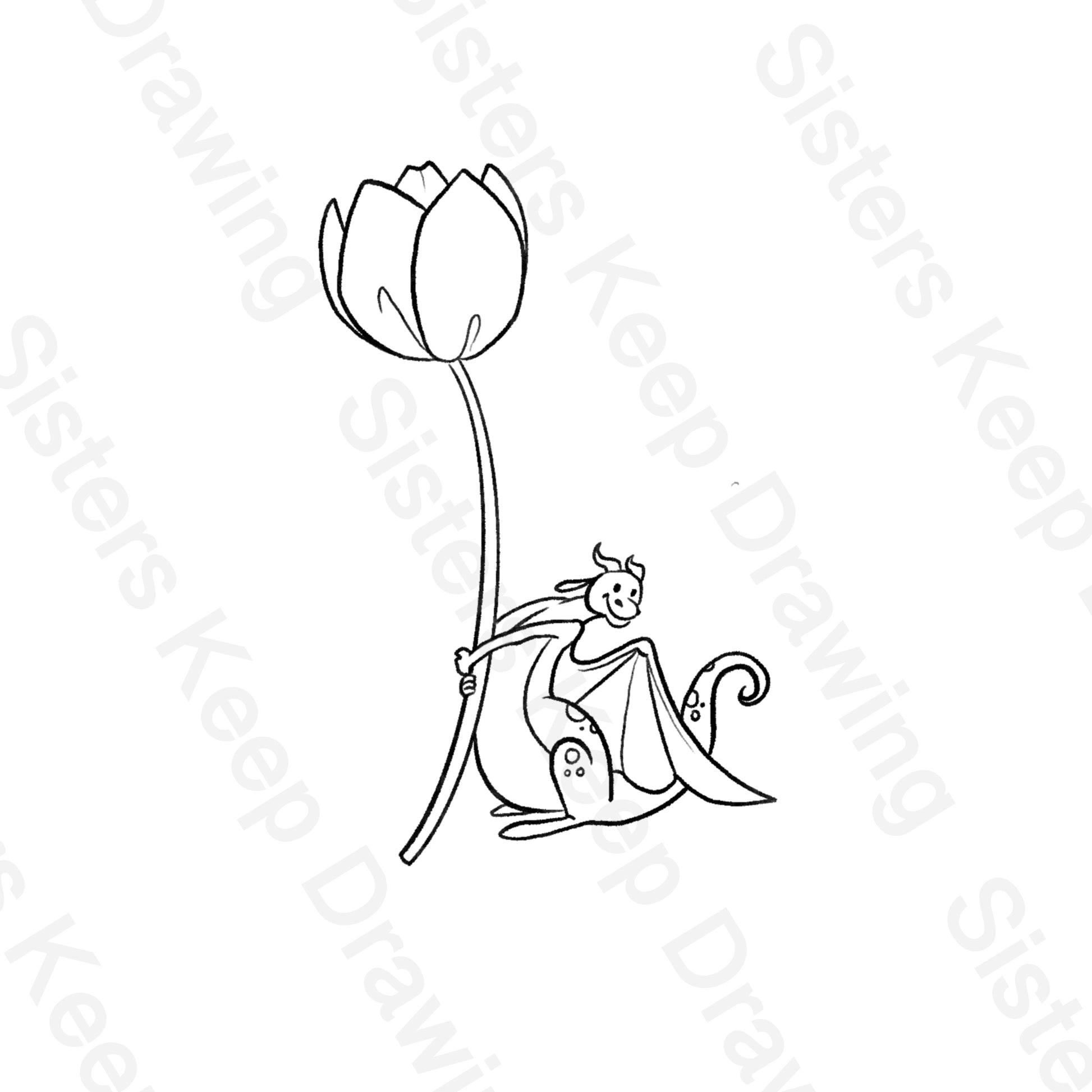 Tiny Dragon holding Tulip-Tattoo Transparent Permission PNG- instant download digital printable artw
